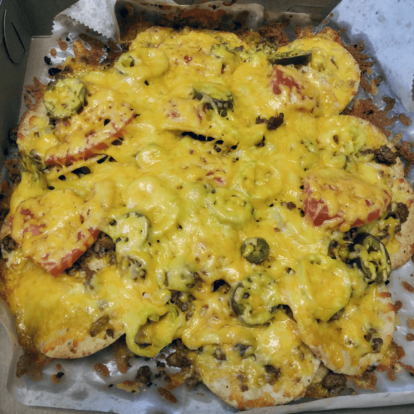 Our Nacho Supreme comes with Beef. Onion, Tomato, Mild Banana Rings, Jalapenos, and Cheese!